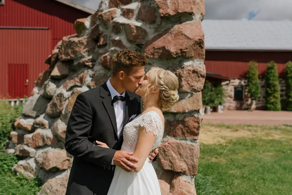 Hela bröllopsdagen utspelade sig på vackra Ulfsbygård i Jomala och miljön var verkligen den perfekta bakgrunden för Riina och Samuels sommarbröllop. Vi hade vädret på vår sida och fick njuta av solen då vi fotograferade porträtt innan vigseln. Gården bjöd både på rustika husfasader och lummig grönska så vi hann med många olika bilder på kort tid. Både solen och värmen höll sig sedan ännu kvar under den stämningsfulla utomhusvigseln och vi hann till och med med en skål ute innan regnmolnen drog sig närmare.Vem klagar ens på ett stilla sommarregn mitt i värmeböljan, speciellt när festen får fortsätta inomhus.